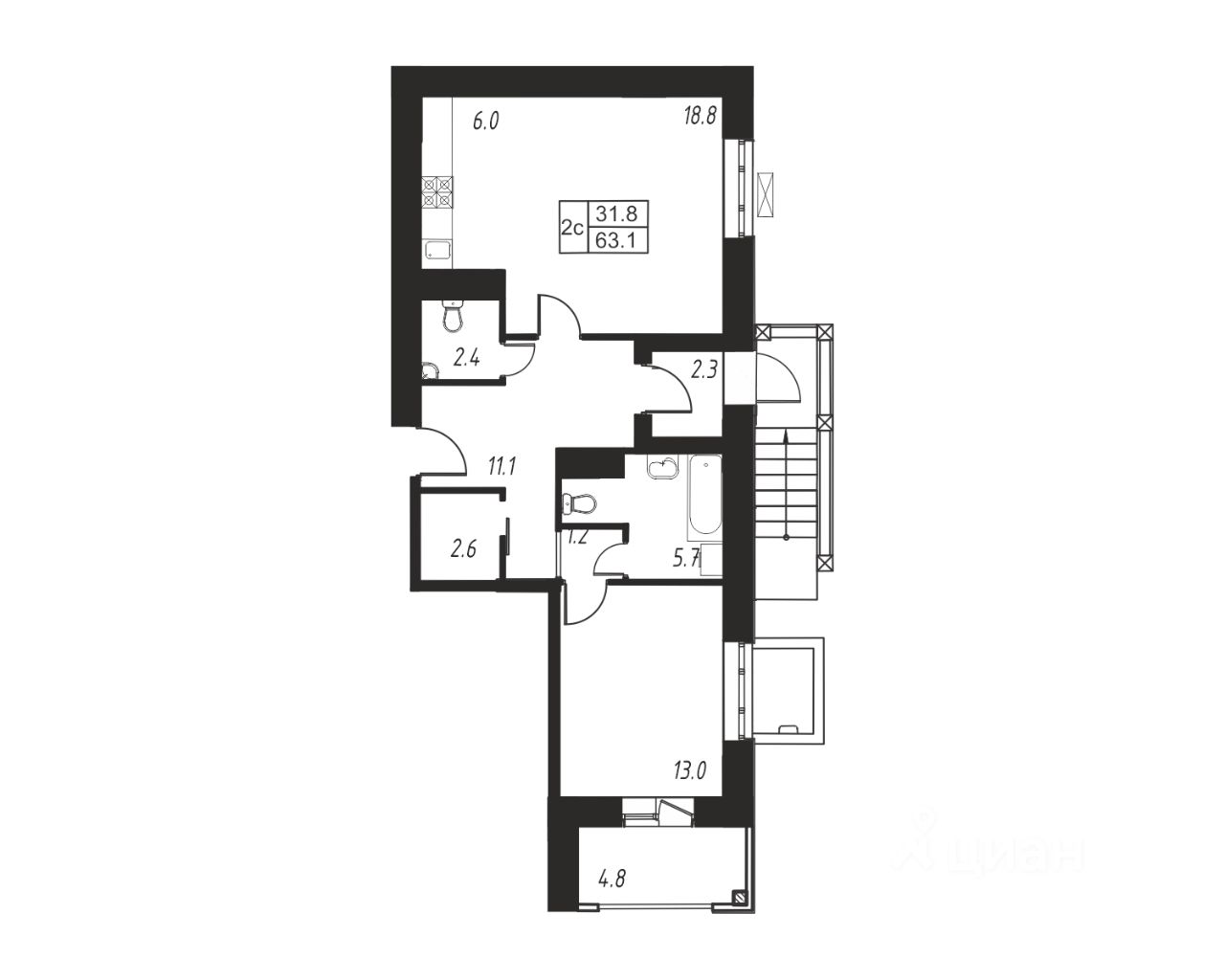 Продаётся 2-комнатная квартира в сданном доме (Корпус 10.1), срок сдачи: 4-кв. 2022, общей площадью 66.40 кв.м., на 1 этаже.