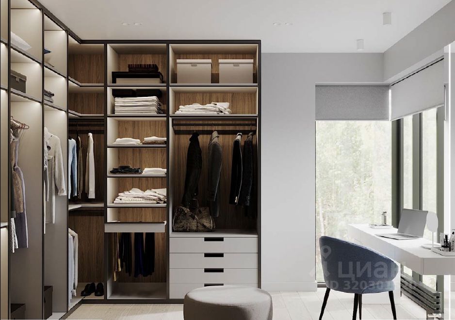 На первом этаже прихожая, гостевая спальня со своими санузлом и гардеробной комнатой, которую при желании можно оборудовать в качестве рабочего кабинета. Под лестницей размещена просторная постирочная. Кухня с кладовой, столовая с выходом на террасу и светлая гостиная. В помещении с отдельным входом расположена газовая котельная. На втором этаже полноценная мастер спальня с большой гардеробной и ванной комнатами, две детские спальни со своими санузлами и гардеробными. В одной из комнат присутствует балкон.