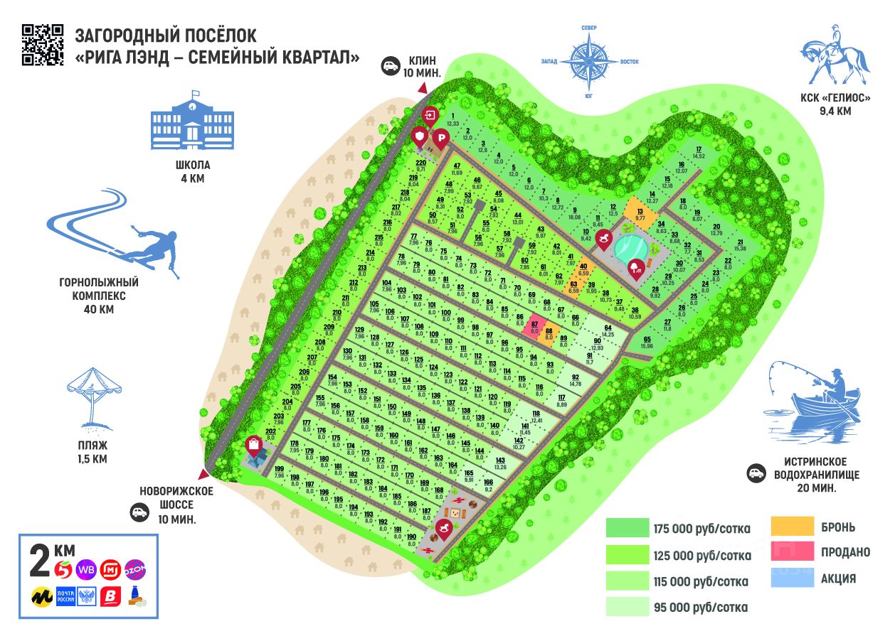 Компания-девелопер Новая Земля предлагает к продаже земельный участок в новом коттеджном поселке ИЖС Рига Лэнд Семейный Квартал, площадь участка 8,0 соток (163 на плане поселка), рядом с лесом. Отличная транспортная доступность: 65 километров от МКАД по скоростному Новорижскому шоссе М9, ост. деревня Тиликтино. Также можно проехать по Ленинградскому шоссе. Есть автобусные маршруты до вокзала города Клин и ж/д платформы Новопетровское. Коттеджный поселок находится в тихом, живописном месте, у леса. Рядом, в 15-20 минутах езды расположены Истринское и Рузское водохранилища со множеством пляжей, мест для рыбалки, водных видов спорта. Также есть пляж на реке Нудоль это в 20 минутах ходьбы от поселка.