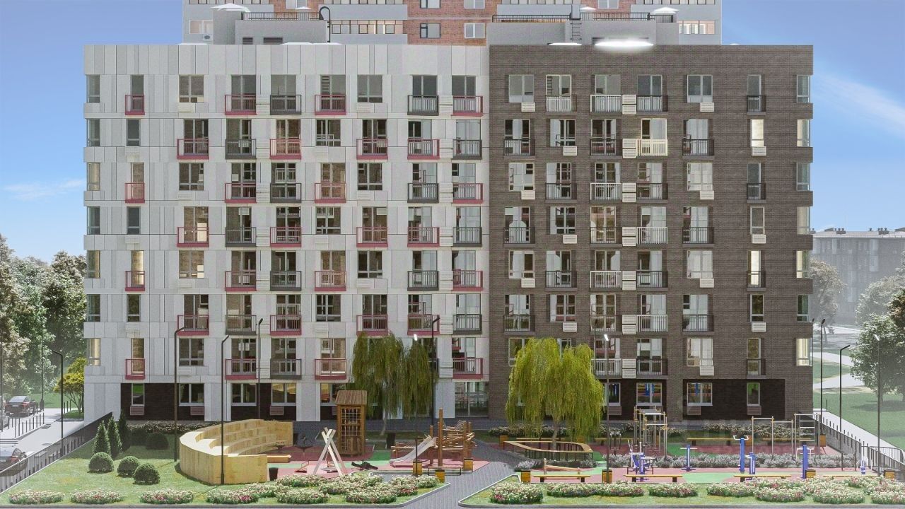 Проект жилого комплекса предусматривает наличие детской и спортивной площадок, кладовые помещения, гостевой паркинг и озеленение.