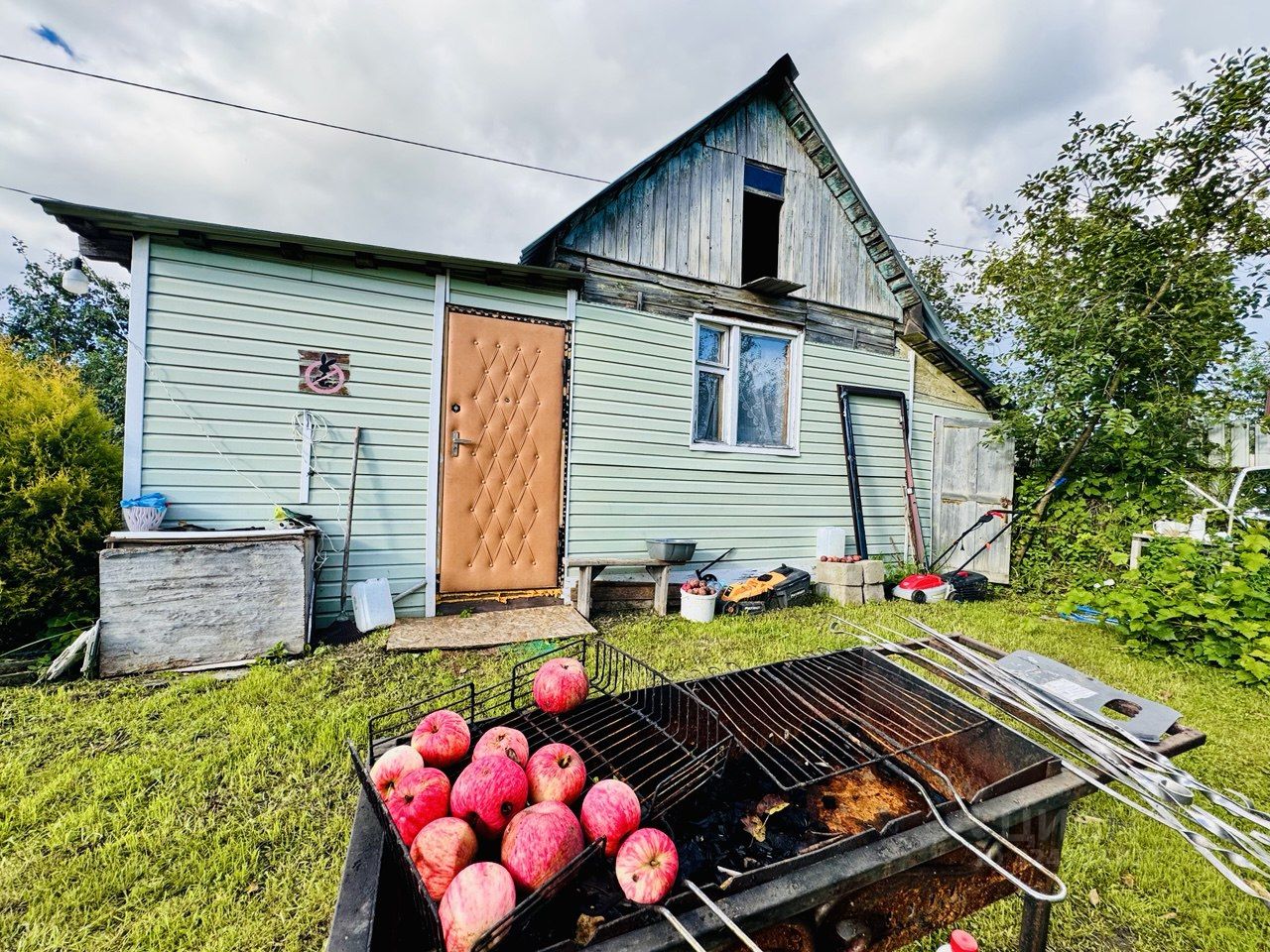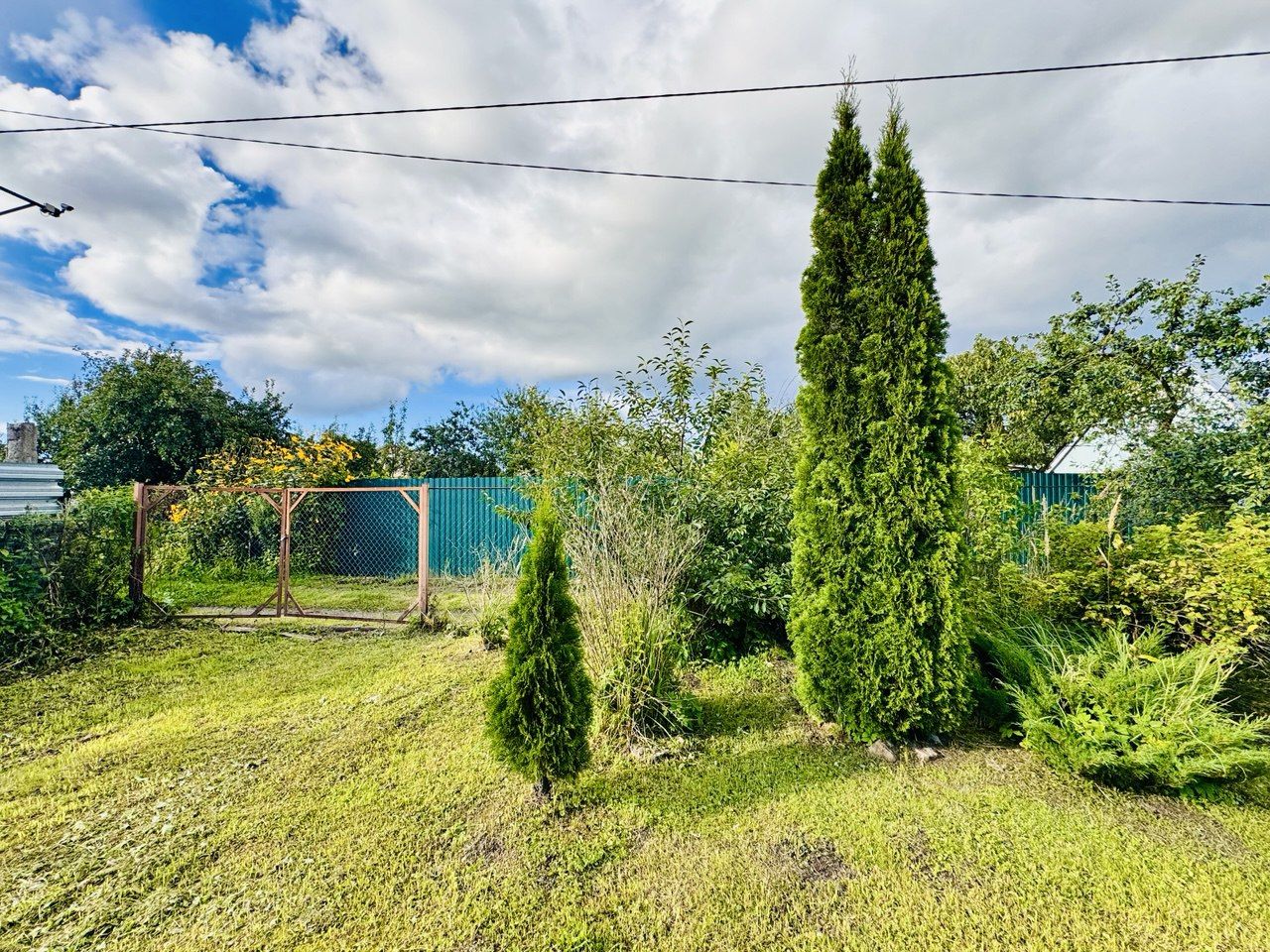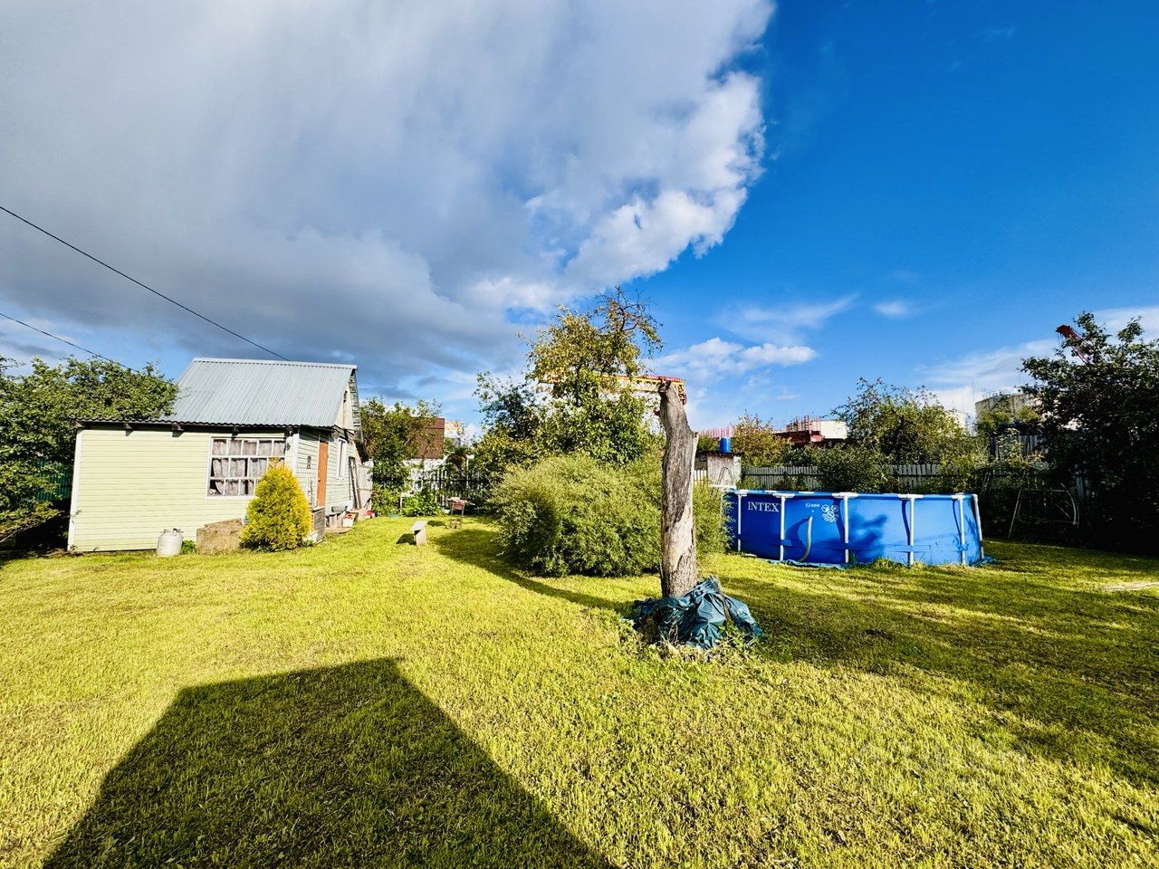 На участке имеется небольшой летний домик Плодовые деревья и кустарники (яблоня, вишня, слива, смородина, малина, крыжовник).