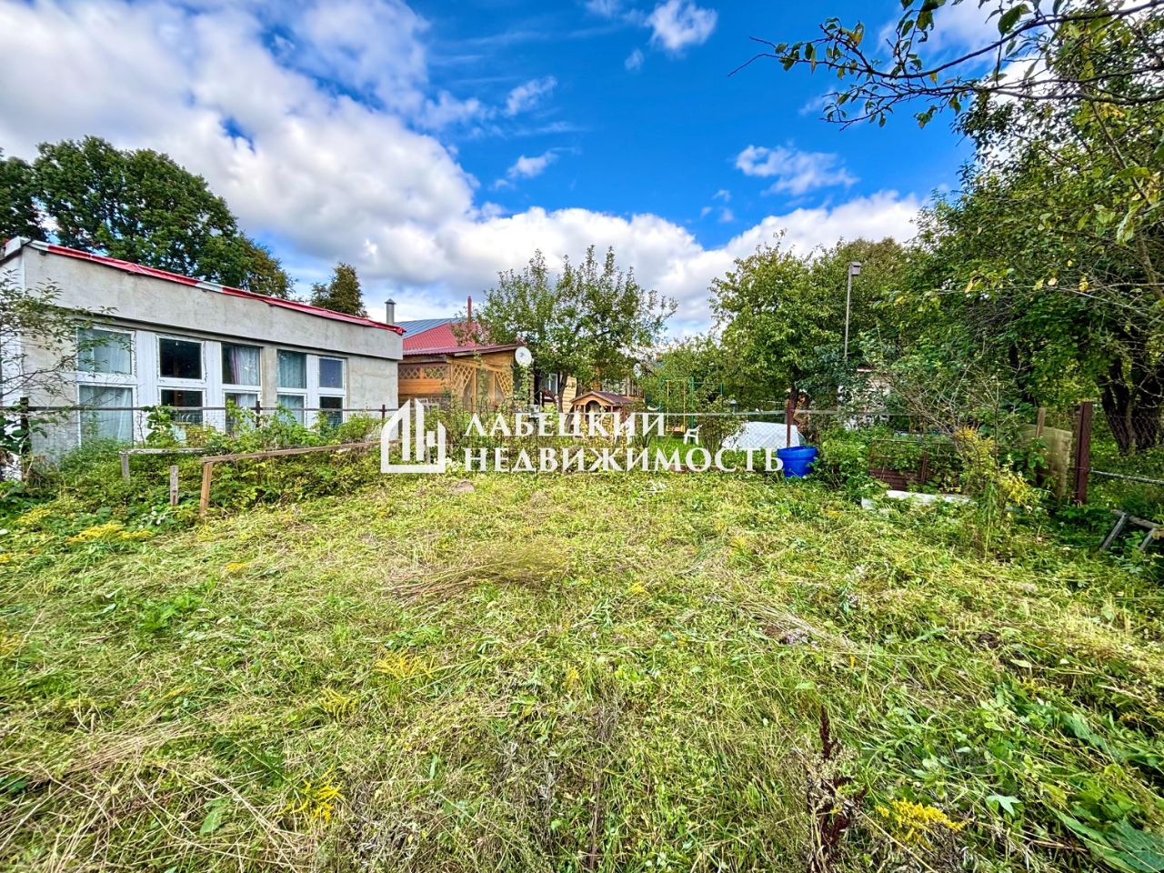 Есть старенький сарай. В конце участка теплица. Перед участком места, на 2-3 машины.